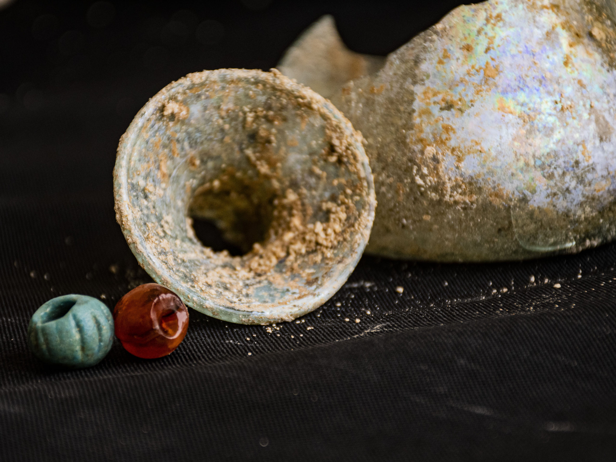 כלי זכוכית וחרוזים שהתגלו במערה.צילום יולי שוורץ