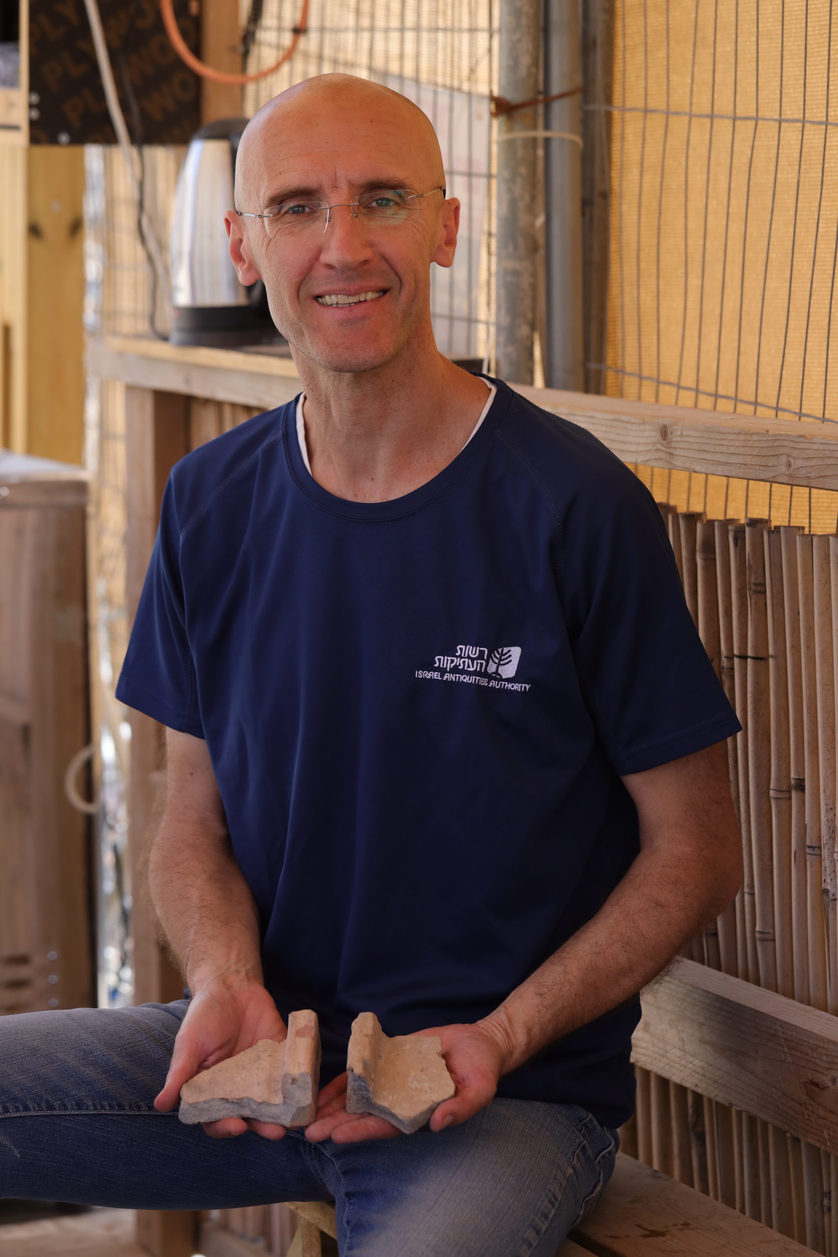 דר פיליפ ווקוסבוביץ מציג את שברי הרעפים. צילום אליהו ינאי