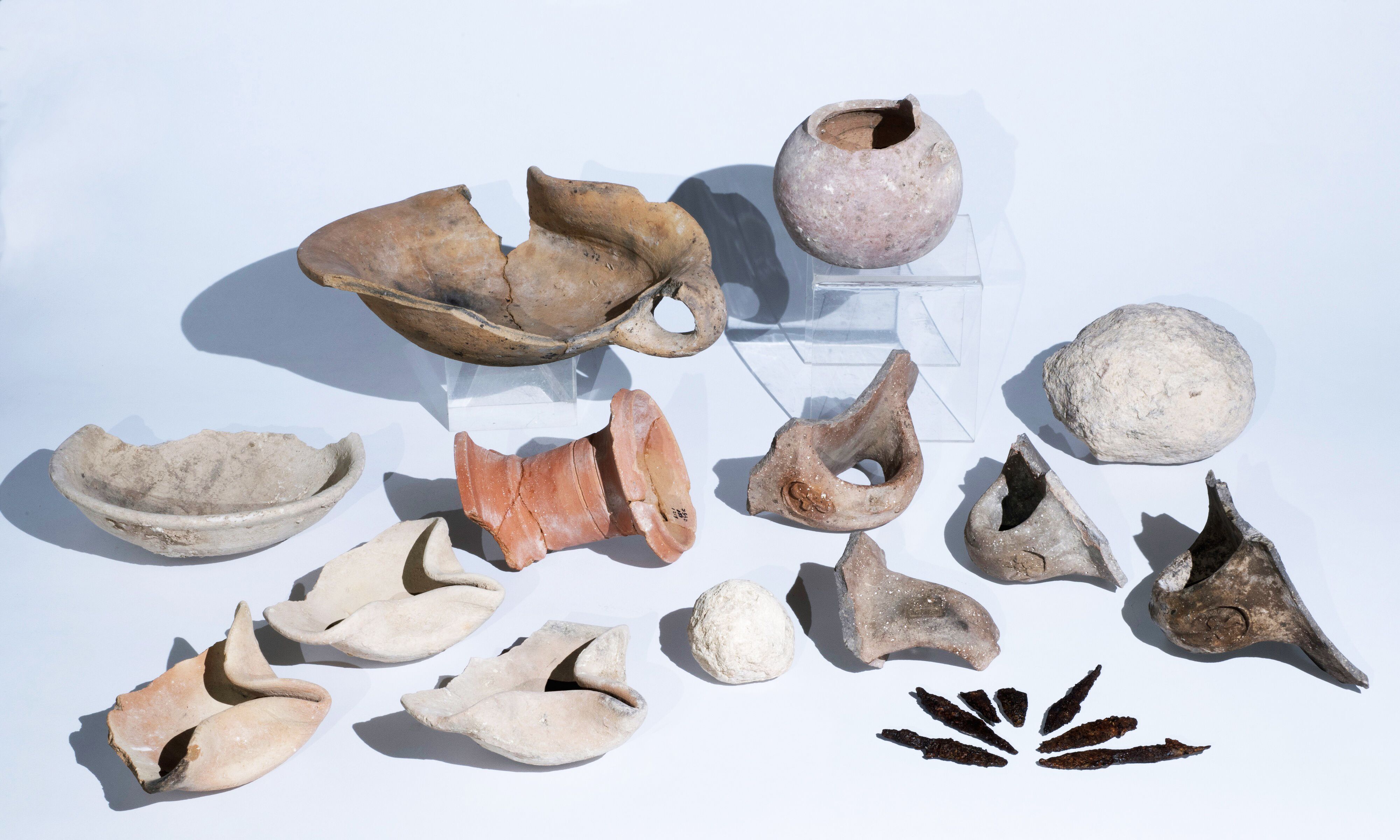 ממצאים מתק' בית ראשון שנחשפו בחפירה – נרות שמן, טביעות חותם שהוטבעו לזיהוי קנקנים, ראשי חיצים, ועוד. צילום: קלרה עמית